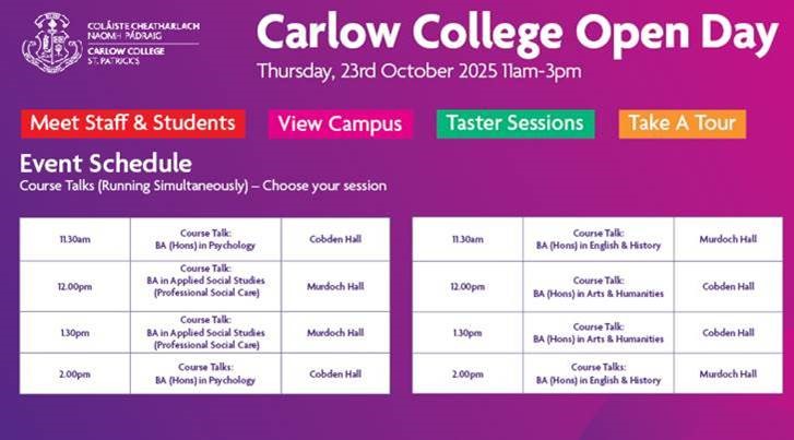 Carlow College will host its Autumn Open Day on Thursday, 23rd October from 11am to 3pm.