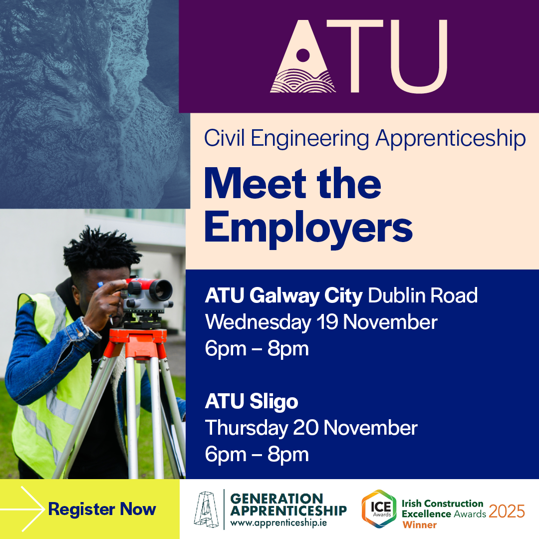 Gain your BEng in Civil Engineering or Higher Certificate in Civil Engineering while earning a full-time income – spend four days a week working with your employer and one day per week studying online with expert academics at ATU plus one day per month on campus for lab work.